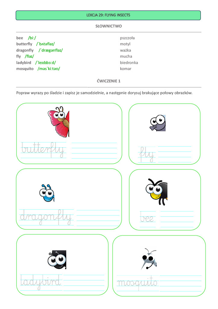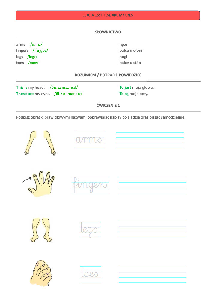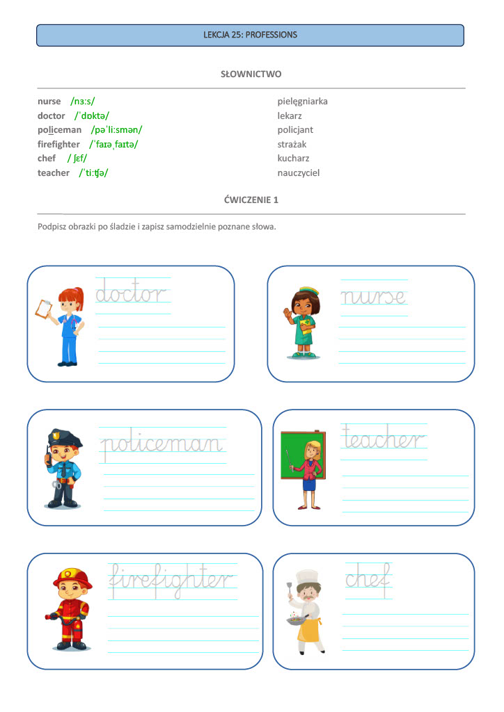 Przygotowałam 63 praktyczne lekcje, które pomagają utrwalić słownictwo i proste zwroty w przyjazny, angażujący sposób. Dzięki ćwiczeniom z pisaniem po śladzie, karty pracy sprawdzają się również u uczniów, który jeszcze nie opanowali umiejętności pisania. Ćwiczenia z pisaniem po śladzie obejmują lekcje od 1 do 38. We wszystkich 63 kartach pracy znajdują się linie pomocnicze do pisania tak, aby uczniowie, który już ten etap nauki mają za sobą nie nudzili się, a wręcz poczuli osobiste wyzwanie.