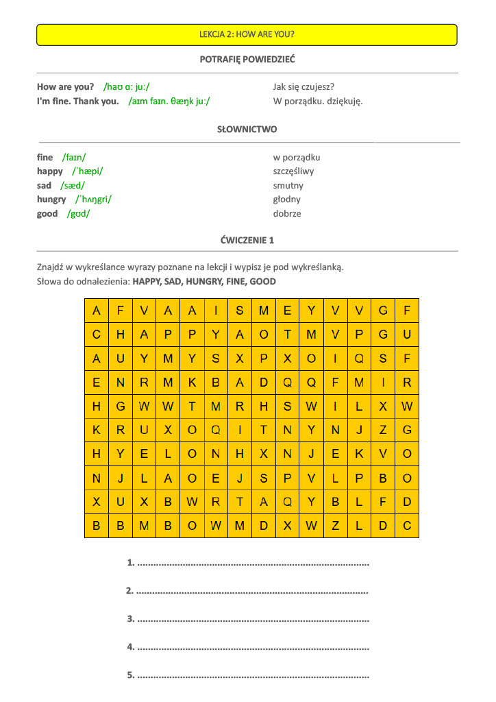 - Skupienie na utrwaleniu prostych zwrotów i podstawowych konstrukcji językowych.