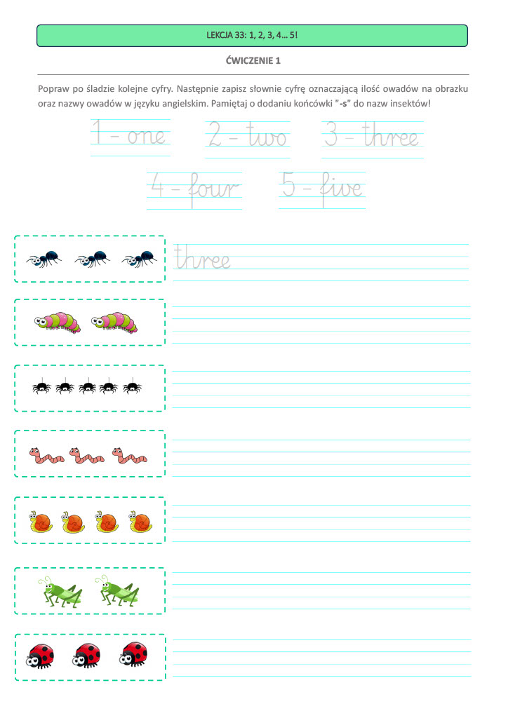 - Linie pomocnicze oraz ćwiczenia do pisania po śladzie (od 1 do 38 lekcji) – idealne dla uczniów, którzy stawiają pierwsze kroki w pisaniu.